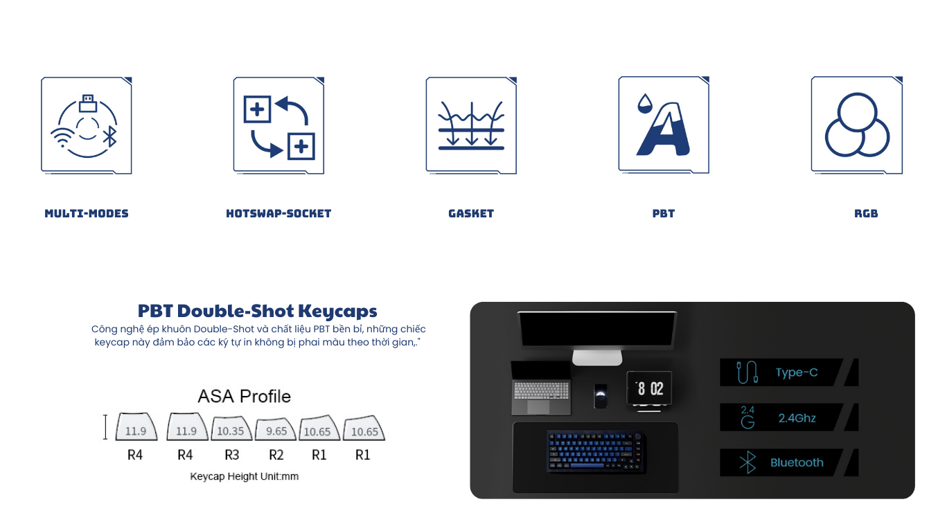 - Keycap PBT Double-Shot, ASA profile với khả năng xuyên LED