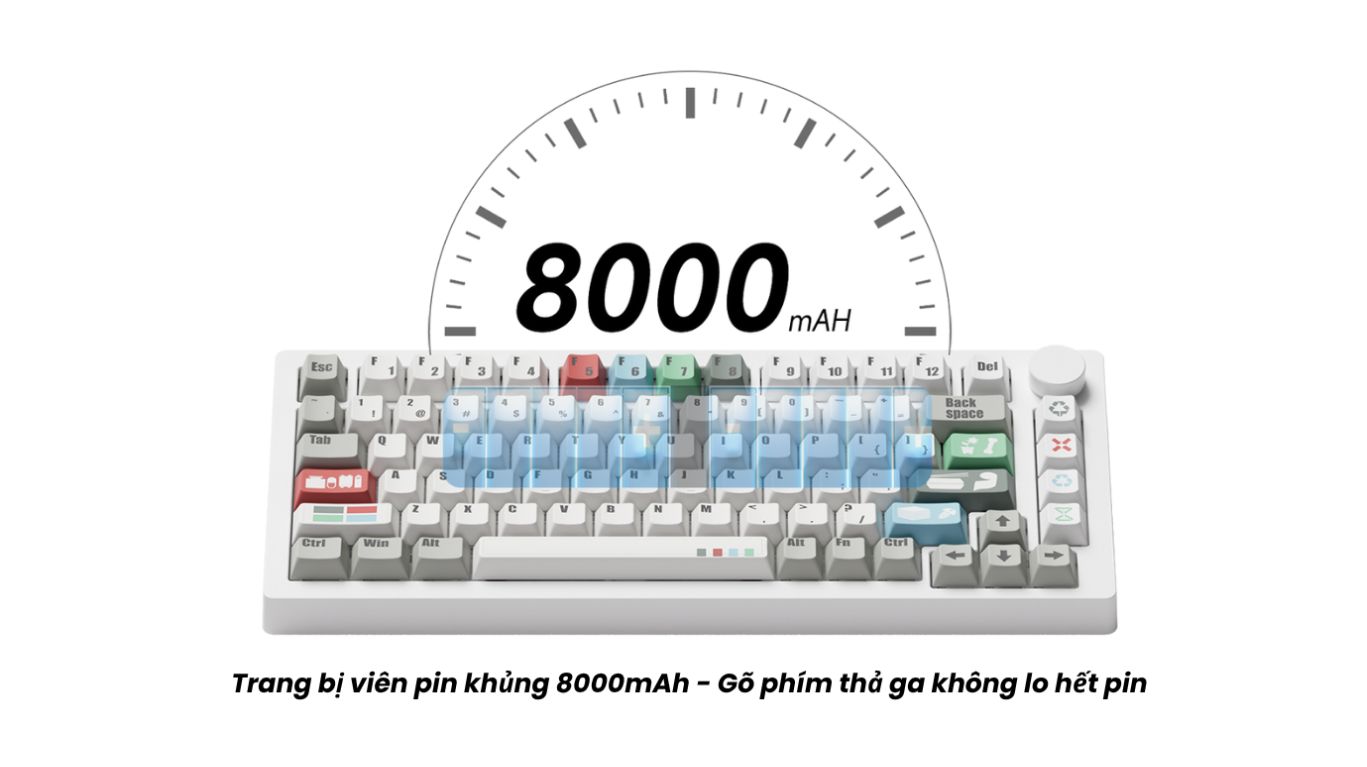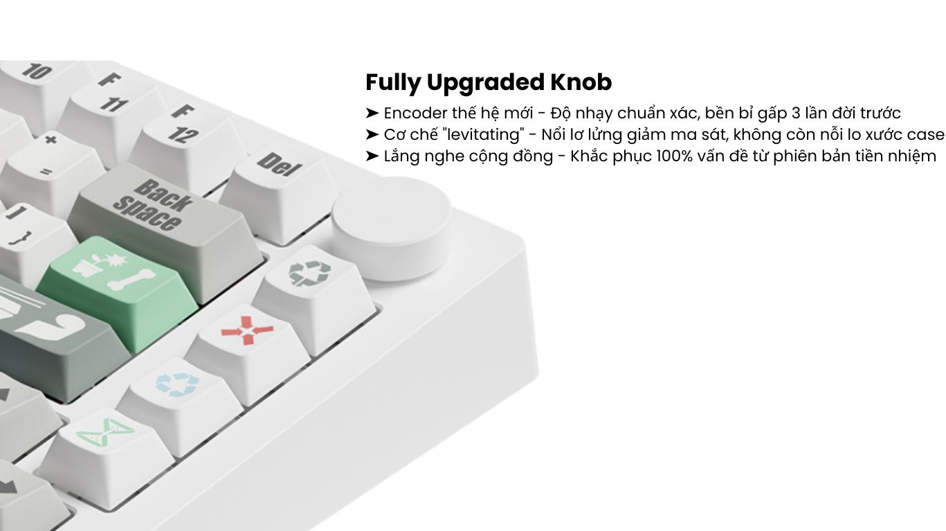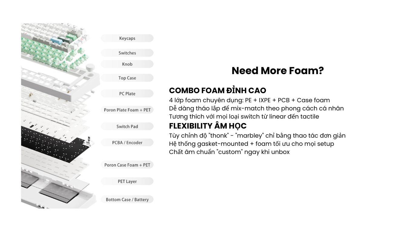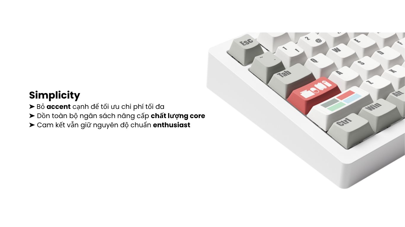 - Stabilizer (Dây ổn định phím): Lắp sẵn stabilizer dạng plate-mounted, chất liệu TPU double-shot