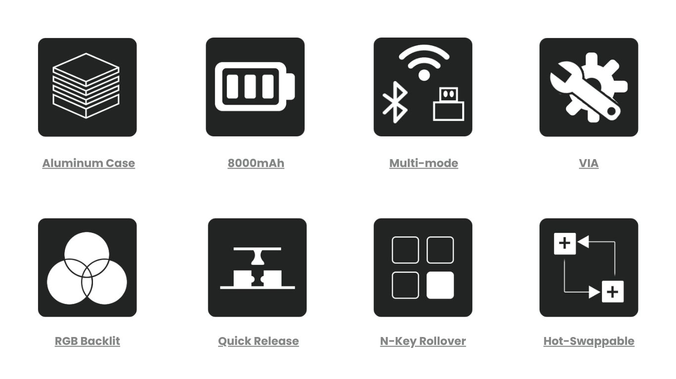 - Phụ kiện đi kèm: Bàn phím ×1,Hướng dẫn sử dụng ×1,Cáp Type-C ×1,keycap Puller ×1,switch Puller ×1,Bộ thu 2.4GHz ×1,Switch dự phòng,Đậy bàn phím.