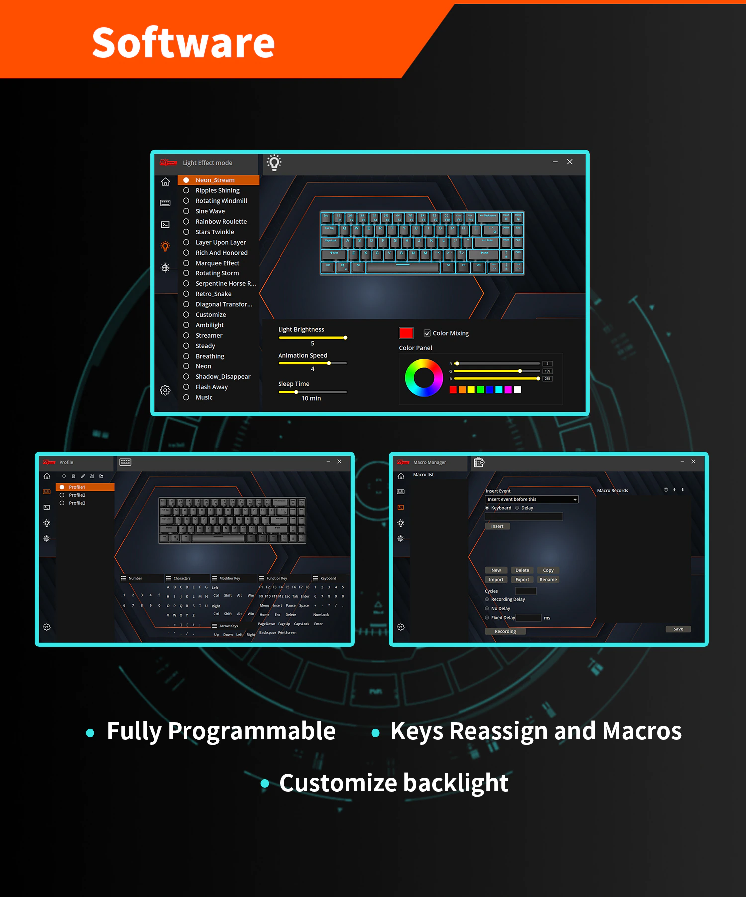 Tất nhiên không thể thiếu led RGB rồi. Người dùng có thể thoải mái lựa chọn mọi màu sắc, hiệu ứng cho từng chiếc bóng led trên chiếc bàn phím thông qua phần mềm hoặc phím tắt của phím
