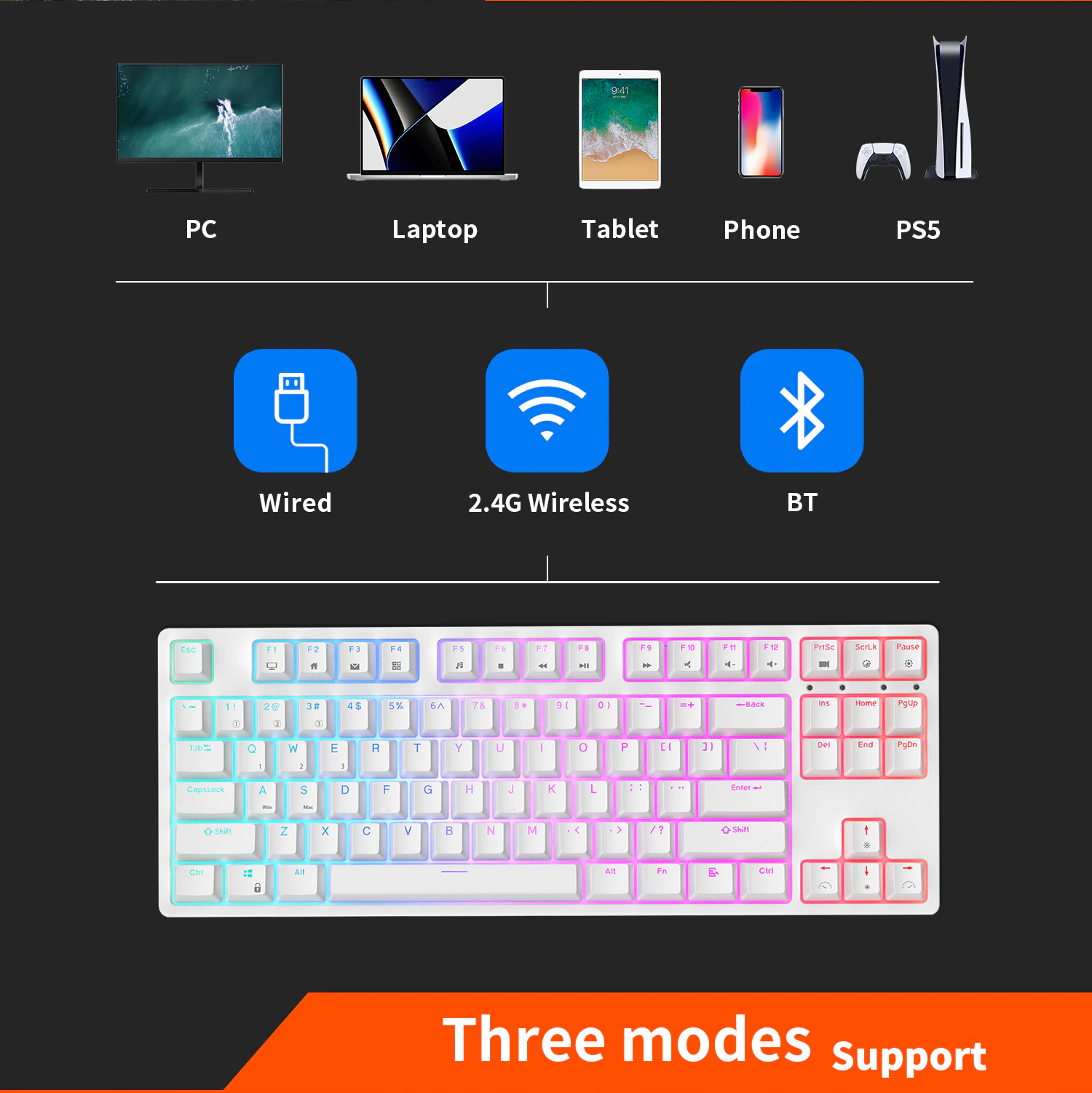 Royal Kludge RK87 được trang bị khả năng kết nối không dây tối ưu nhất hiện nay. Người dùng vừa có thể kết nối thông qua Bluetooth 5.0 chất lượng cao của phím với tối đa 3 thiết bị và có thể chuyển nhanh thông qua phím tắt. Bên cạnh đó, bàn phím đã trang bị sẵn usb receiver 2.4G với độ trễ cực thấp, gần như không có sự khác biệt với bàn phím khi dùng dây. Tuy là bàn phím không dây, nhưng RK87 vẫn có thể sử dụng như một chiếc bàn phím có dây thông thường thông qua cổng cắm Type-C trên bàn phím