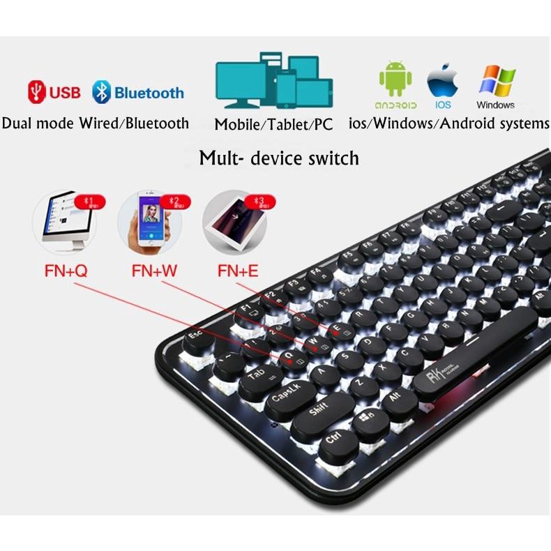 - Bàn phím cơ Royal Kludge RK960 kết nối bluetooth hỗ trợ kết nối 3 thiết bị bluetooth cùng một lúc, nhấn FN + Q, FN + W, FN + E để chuyển sang.