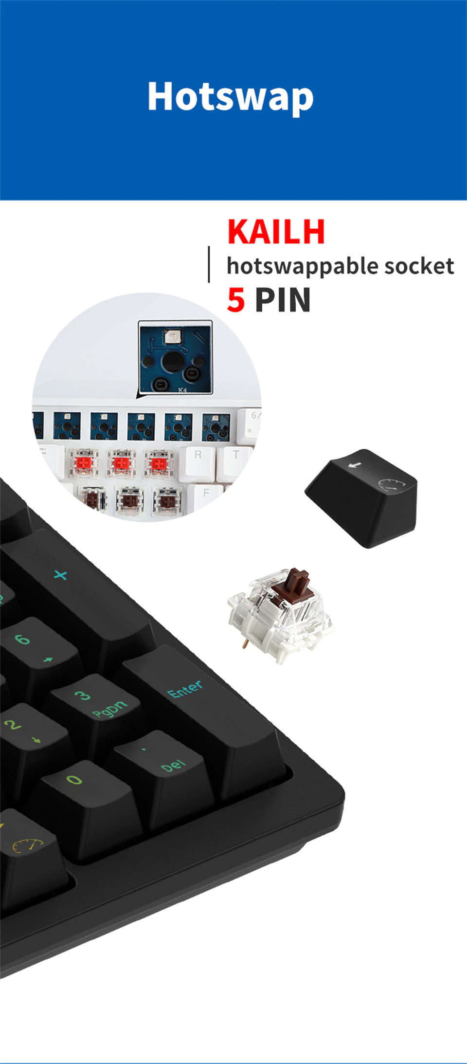 Hotswap - Khả năng thay nóng switch trong vòng 1 nốt nhạc. Với tính năng này, người dùng có thể thoải mái trải nghiệm tất cả các loại switch trên thị trường từ tầm trung tới cao cấp. Bàn phím cơ Royal Kludge RK98 có mạch hotswap hỗ trợ switch cả 3 pin (3 chân) và 5 pin (5 chân)
