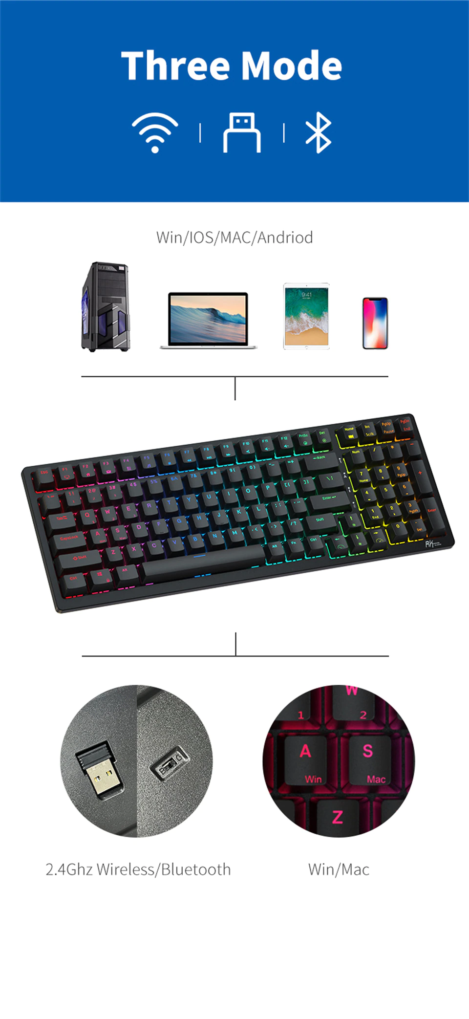 Bàn phím cơ Royal Kludge RK98 hotswap kết nối 3 chế độ (Bluetooth 5.0 | Wireless 2.4G | Dây type C)