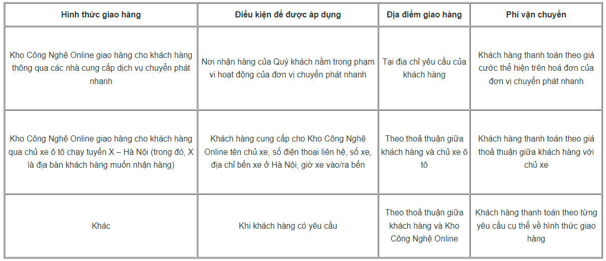 Khi mua hàng tại Kho Công Nghệ Online, Kho Công Nghệ Online giao hàng cho khách hàng thông qua các nhà cung cấp dịch vụ chuyển phát.