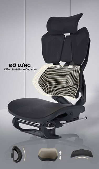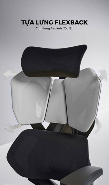- Tựa lưng: FlexBack – Công nghệ lưng ghế 4 mảnh độc lập: 3 mảnh trên ôm sát vai và lưng trên giúp giữ tư thế vững chắc, 1 mảnh dưới cong hỗ trợ thắt lưng có thể điều chỉnh lên/xuống linh hoạt để khớp hoàn hảo với cơ thể