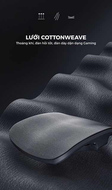 - Chất liệu lưới: Cottonweave nhiều cotton đan dày phong cách gaming khỏe khoắn nhưng vẫn thoáng mát đàn hồi tốt và bền (chứng chỉ OEKO-TEX® STANDARD 100)