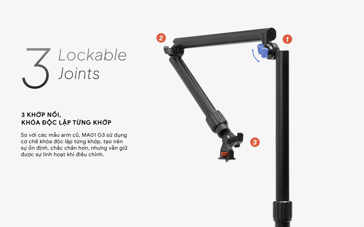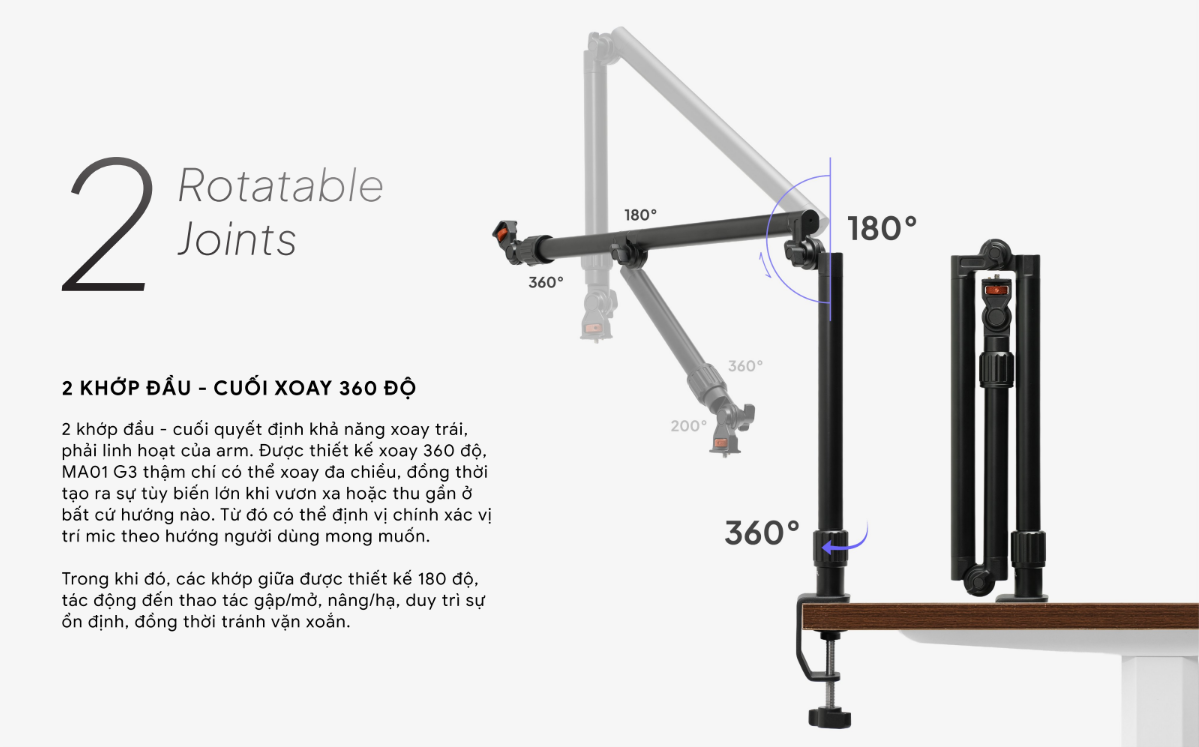- Khả năng điều chỉnh: 3 đốt | Xoay 360 độ (2 khớp đầu và cuối)