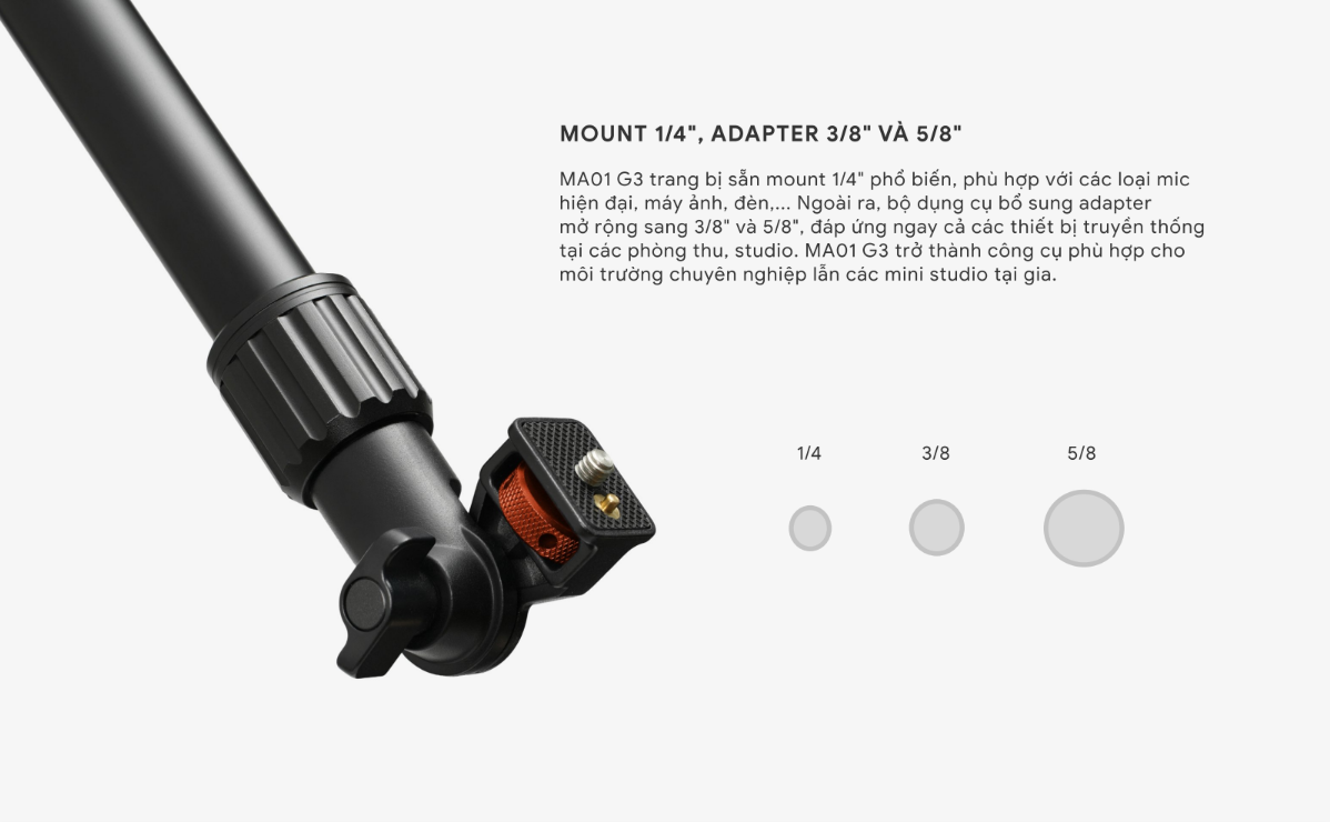 - Mount 1/4" cố định, bổ sung adapter mở rộng 3/8" và 5/8", hỗ trợ nhiều thiết bị hiện đại, chuyên nghiệp