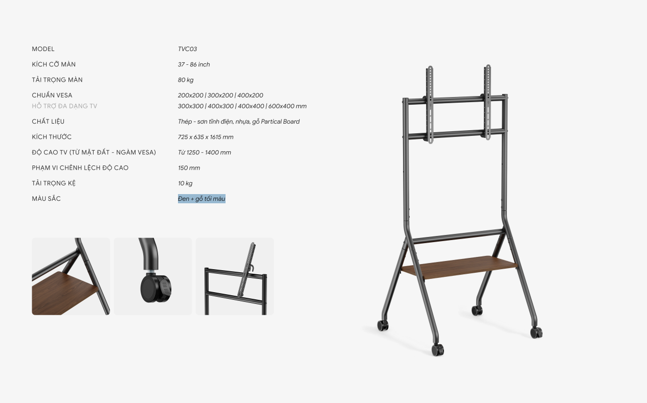 - Chuẩn VESA: Hỗ trợ đa dạng TV 200x200 | 300x200 | 400x200 | 300x300 | 400x300 | 400x400 | 600x400 mm