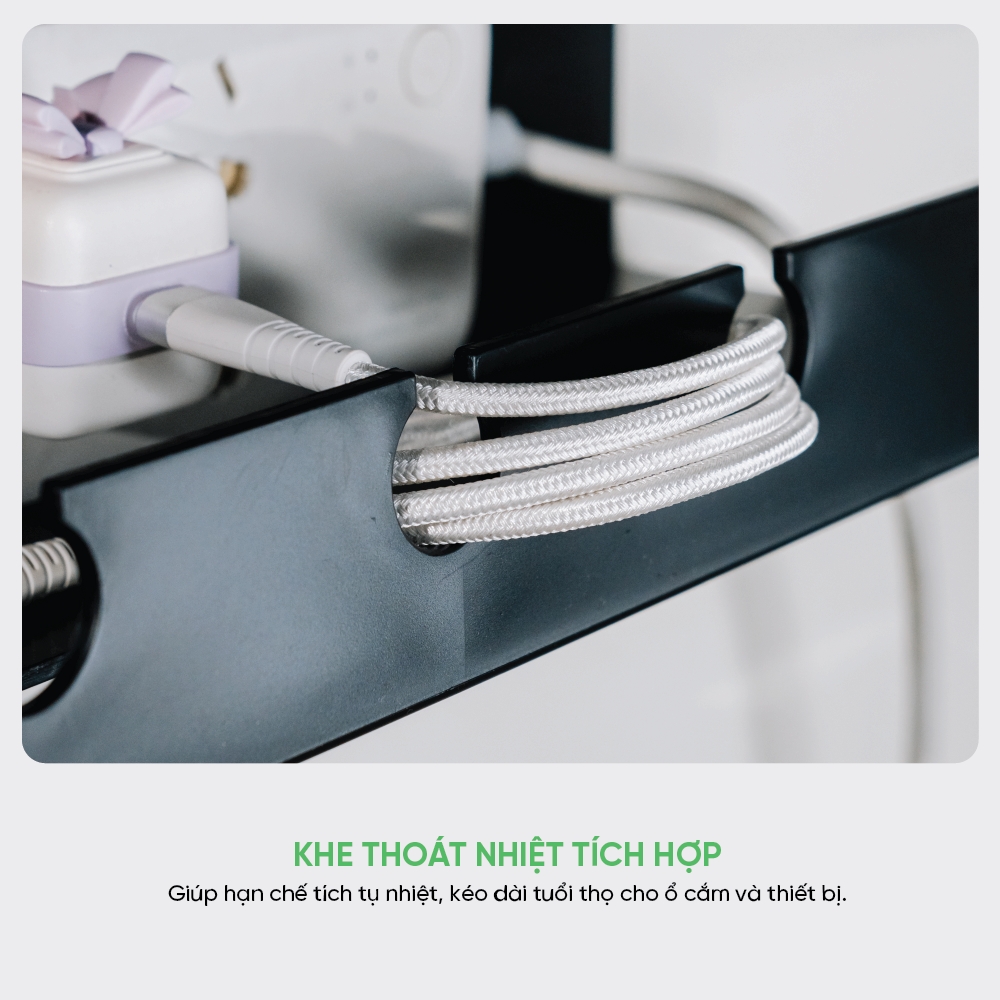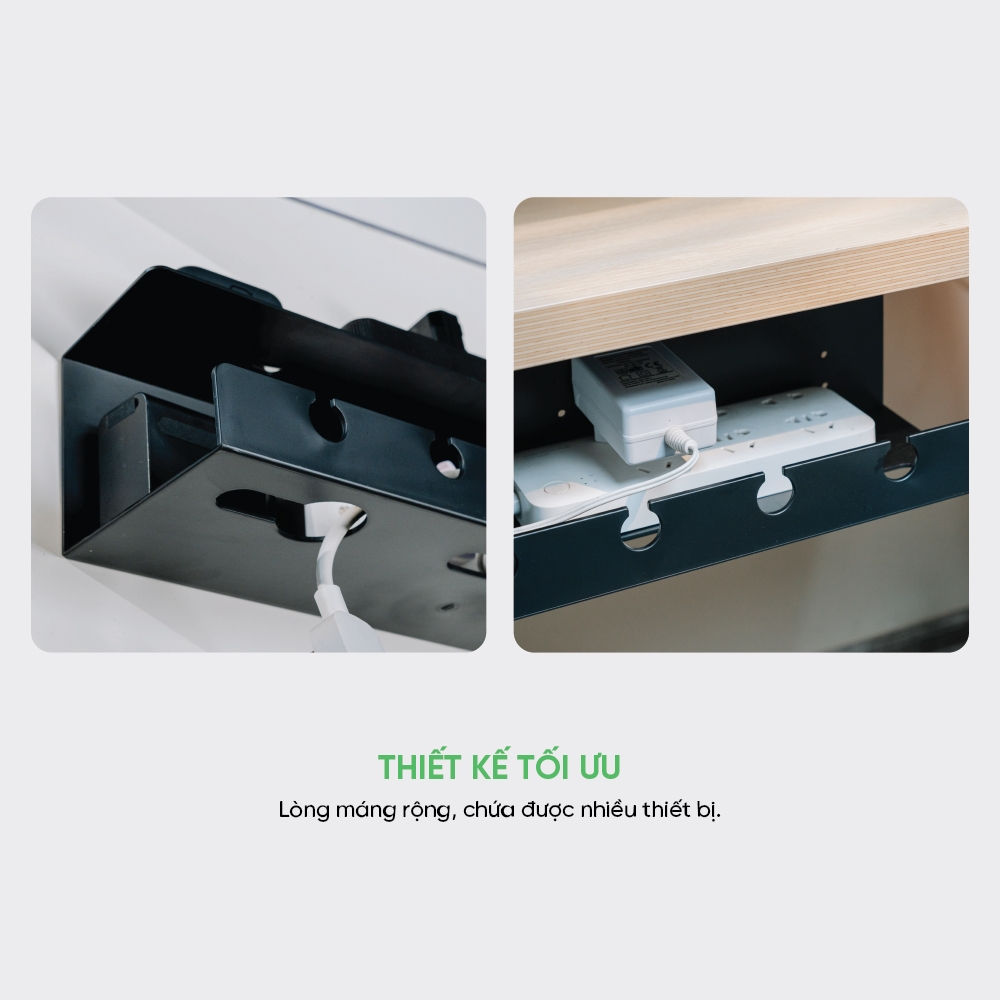- Bạn có thể giấu toàn bộ dây nguồn, ổ cắm điện, bộ sạc, hub USB… vào bên trong máng. Gầm bàn trống trải, sàn nhà sạch sẽ, không còn vướng víu dây nhợ.