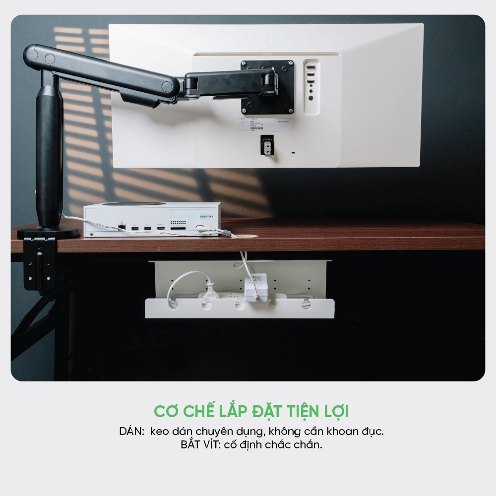 - Người dùng có thể chọn cách dán trực tiếp lên mặt bàn với keo chuyên dụng nếu không muốn khoan đục. Hoặc nếu muốn cố định vĩnh viễn, có thể bắt vít bằng bộ phụ kiện có sẵn.